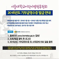 | 서울대학교어린이병원후원회 2016년도 기부금영수증 발급 안내 (0) | 2017.01.09 |